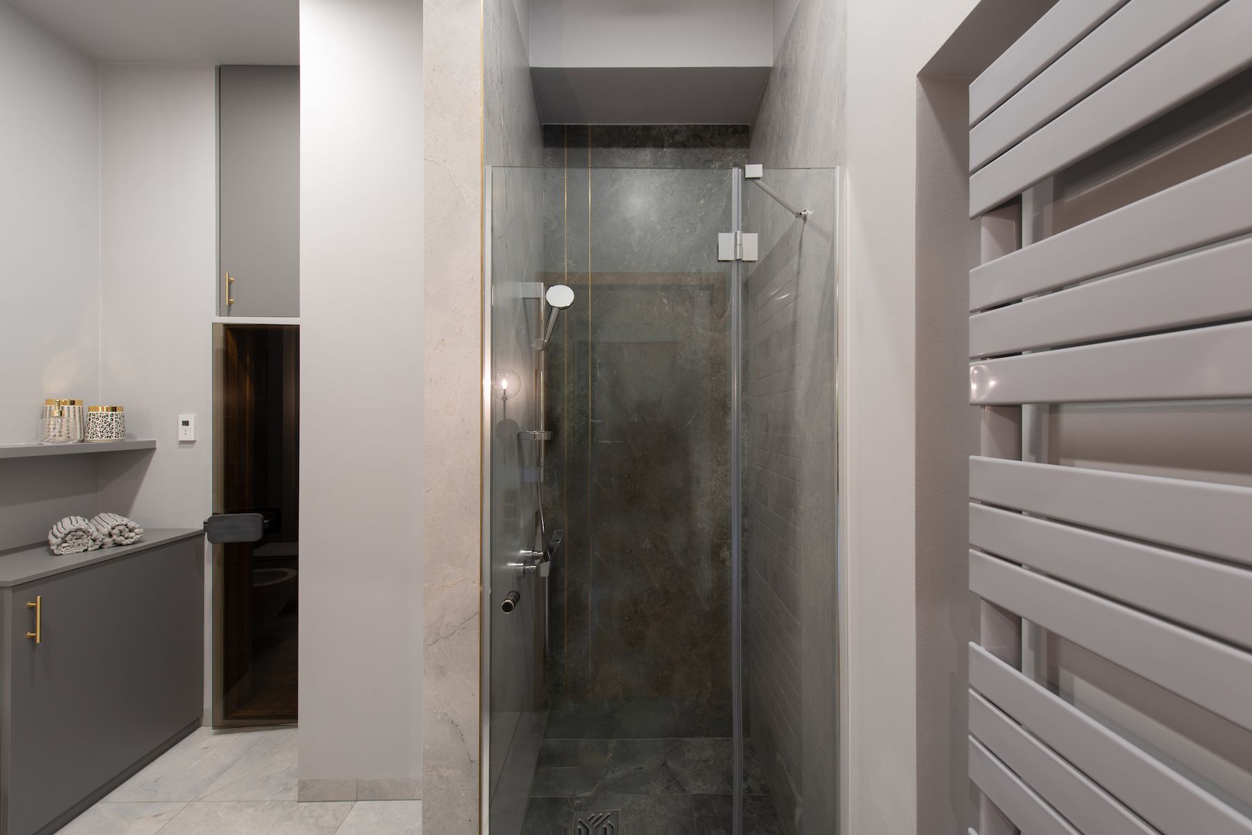 Aranżując funkcjonalność mieszkania, w przypadku aż trzech sypialni przewidzieliśmy potrzebę posiadania więcej niż jednej łazienki. W drugiej łazience znajduje się kabina prysznicowa, toaleta oraz umywalka.