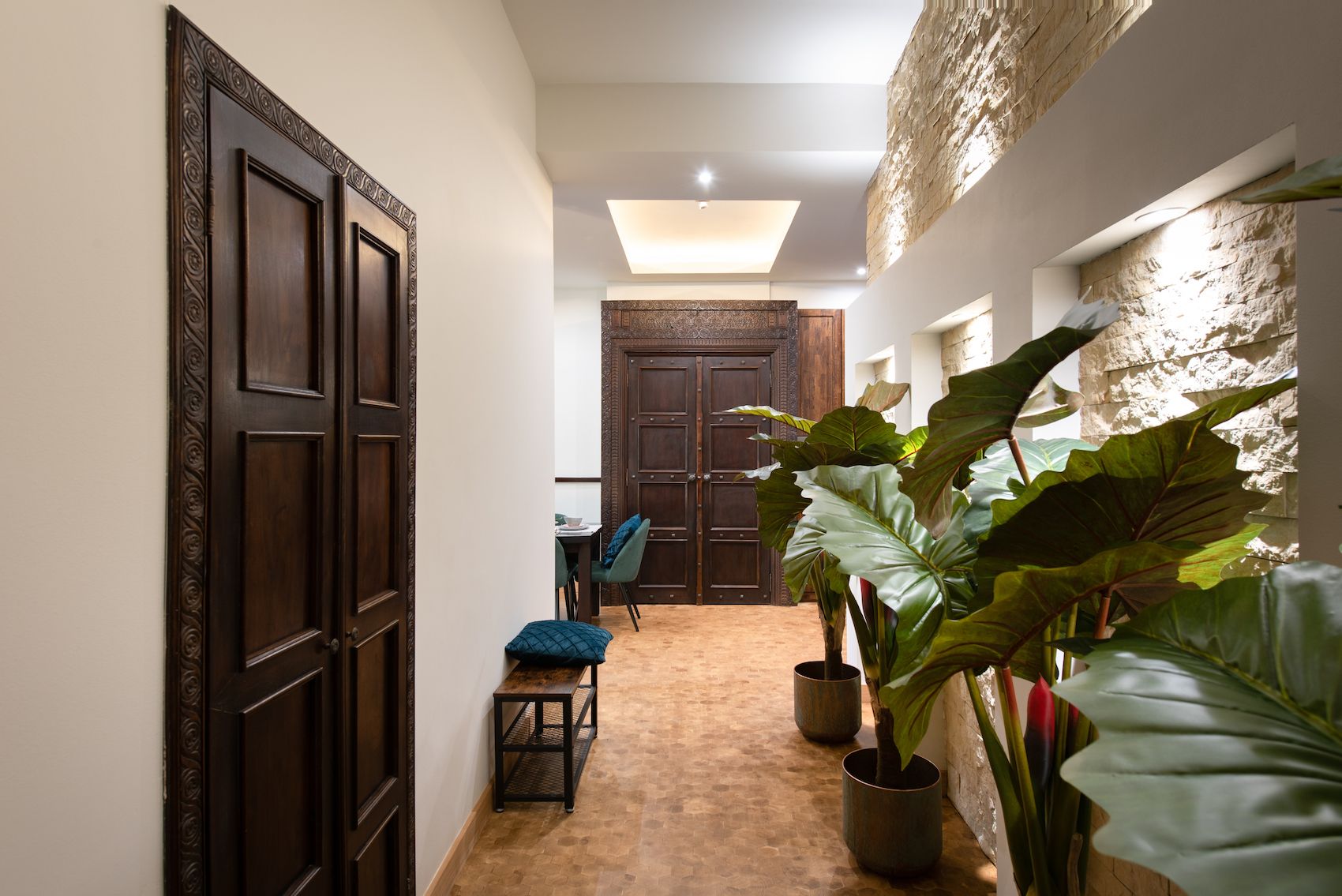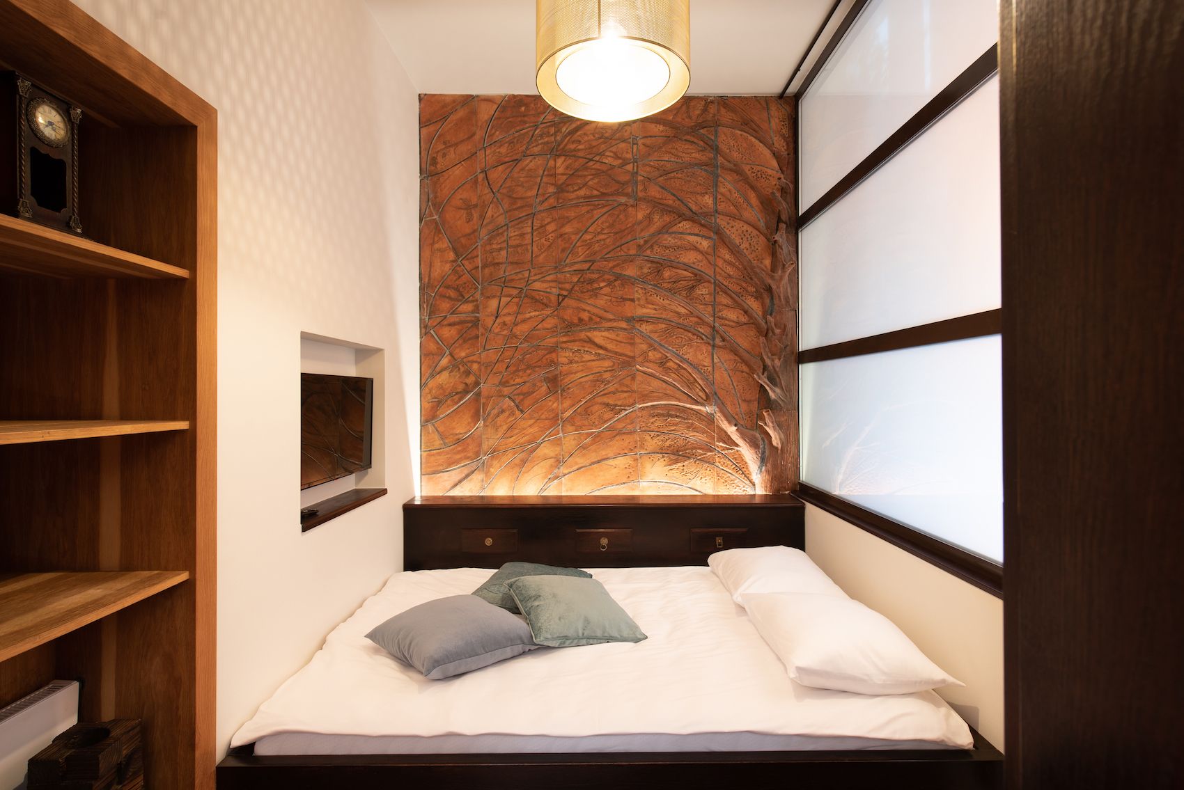 Jedna z mniejszych sypialni od wejścia wita wykonanym na zamówienie ogromnym ceramicznym rękodziełem, odzwierciedlającym trójwymiarowe gałęzie drzew pnące się po ścianach. Podświetlone od dołu łóżko sprawia wrażenie, jakby unosiło się nad podłogą.