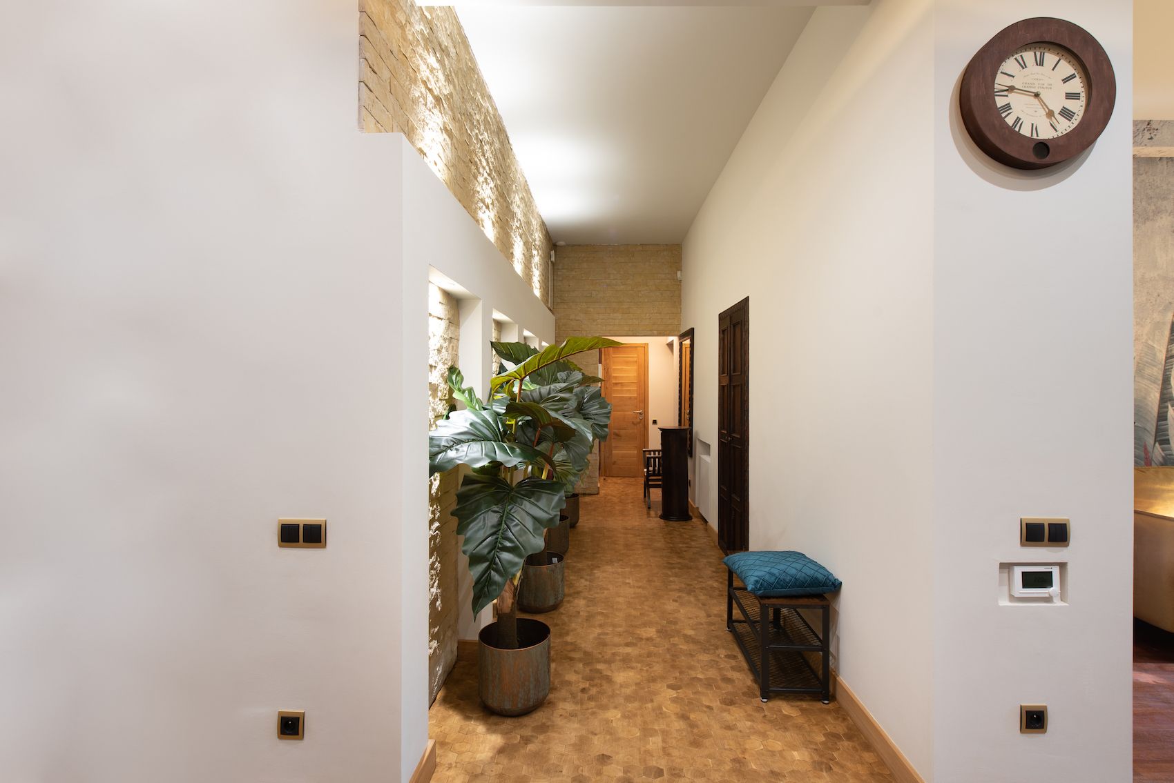 Ideą przyświecającą architektom było przekształcenie korytarza tego apartamentu w ścieżkę prowadzącą w stronę bogato zdobionych drzwi, tworząc atmosferę sekretnego przejścia w nieznane. Ciemna elegancja holu została wzmocniona nietypowym projektem podłogi – jej wzór był udanym eksperymentem ożywiającym dawno zapomniany styl wiejskich ścieżek ogrodowych, w którym kawałki drewna są ciasno ułożone nie poziomo, ale pionowo odsłaniając sieć kontrastującego usłojenia dębowego. „Żywa” mozaika kończy się na końcu korytarza, gdzie płynnie przechodzi w ciemną podłogę z egzotycznego drewna.