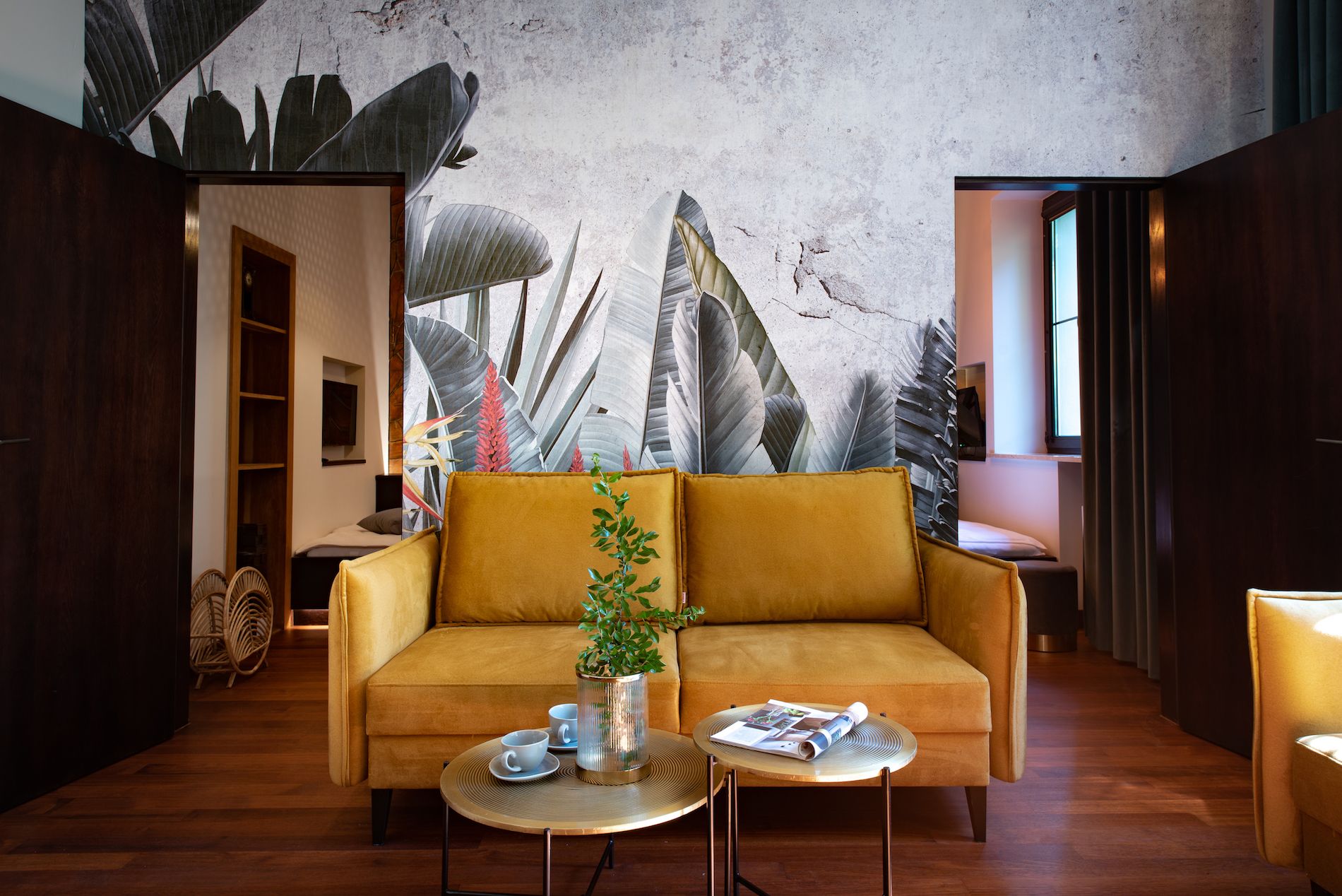Głównym elementem przyciągającym uwagę w salonie jest niezwykła tapeta z motywami kwiatowymi, na tle której kontrastuje miękka, welurowa sofa w kolorze musztardowym. Tapeta z góry oświetlona jest delikatnym światłem, tworząc prawdziwie ciepłą atmosferę w całym pomieszczeniu. Ściana po drugiej stronie pokoju wykoanana jest z cegły. Szykowny zestaw złotych ozdób i egzotyczna podłoga dopełniają wystrój salonu Exotic Elegance.