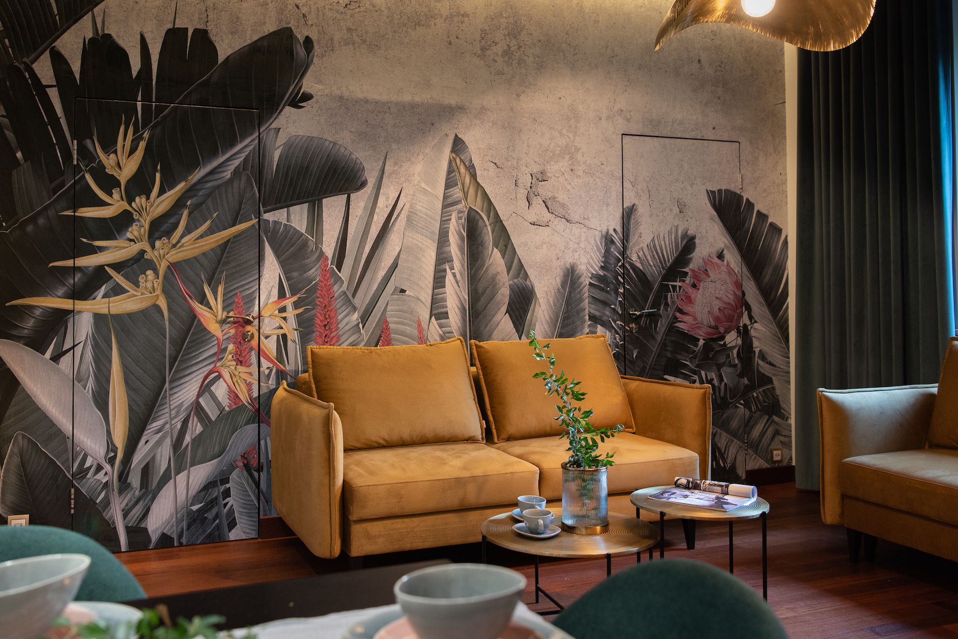 Tapeta z motywem tropikalnym na ścianie w głównej sypilani nawiązuje do wystroju salonu. Pośrodku pokoju znajduje się duże welurowe łóżko, które współtworzy przytulną atmosferę. Obok łóżka stworzyliśmy konstrukcję, którą nazywamy efektem „okna w oknie”. Duża drewniana rama obejmuje ramę okienną, tworząc ławkę przedzieloną małym stolikiem kawowym.