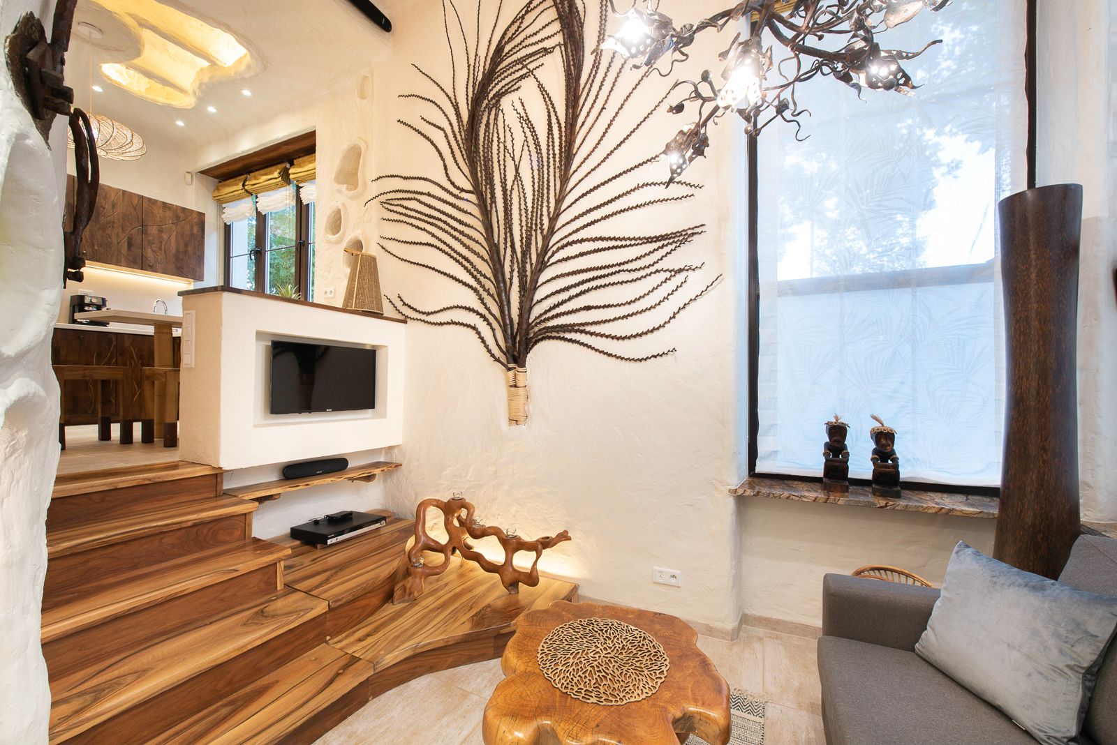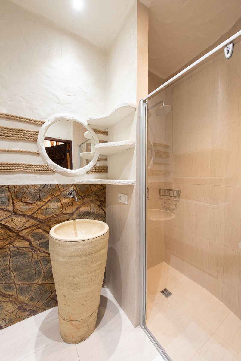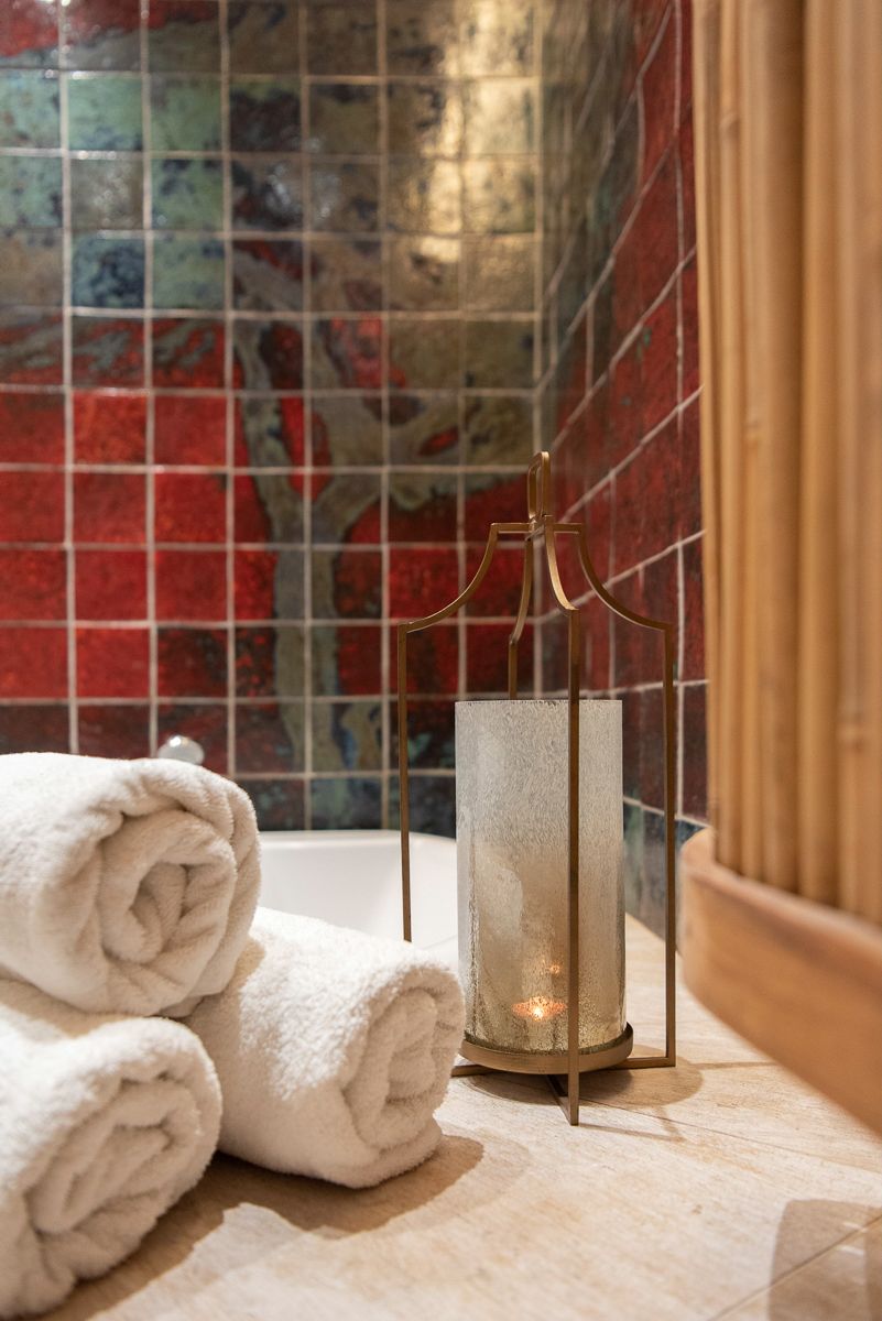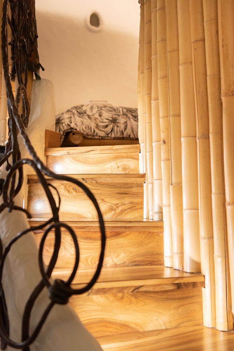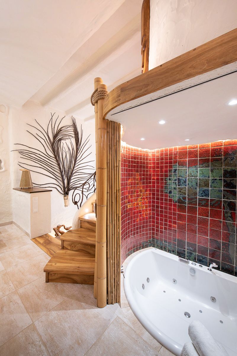 Naprzeciw łazienki bambusowa ściana skrywa wejście do wanny z hydromasażem. Okrągła ściana wewnątrz pokryta jest ręcznie robionymi na zamówienie płytkami z ogromnym wizerunkiem afrykańskiego drzewa. Połączenie nastrojowego oświetlenia, sztuki afrykańskiej i komfortu wanny z pewnością będzie niezapomnianym przeżyciem.